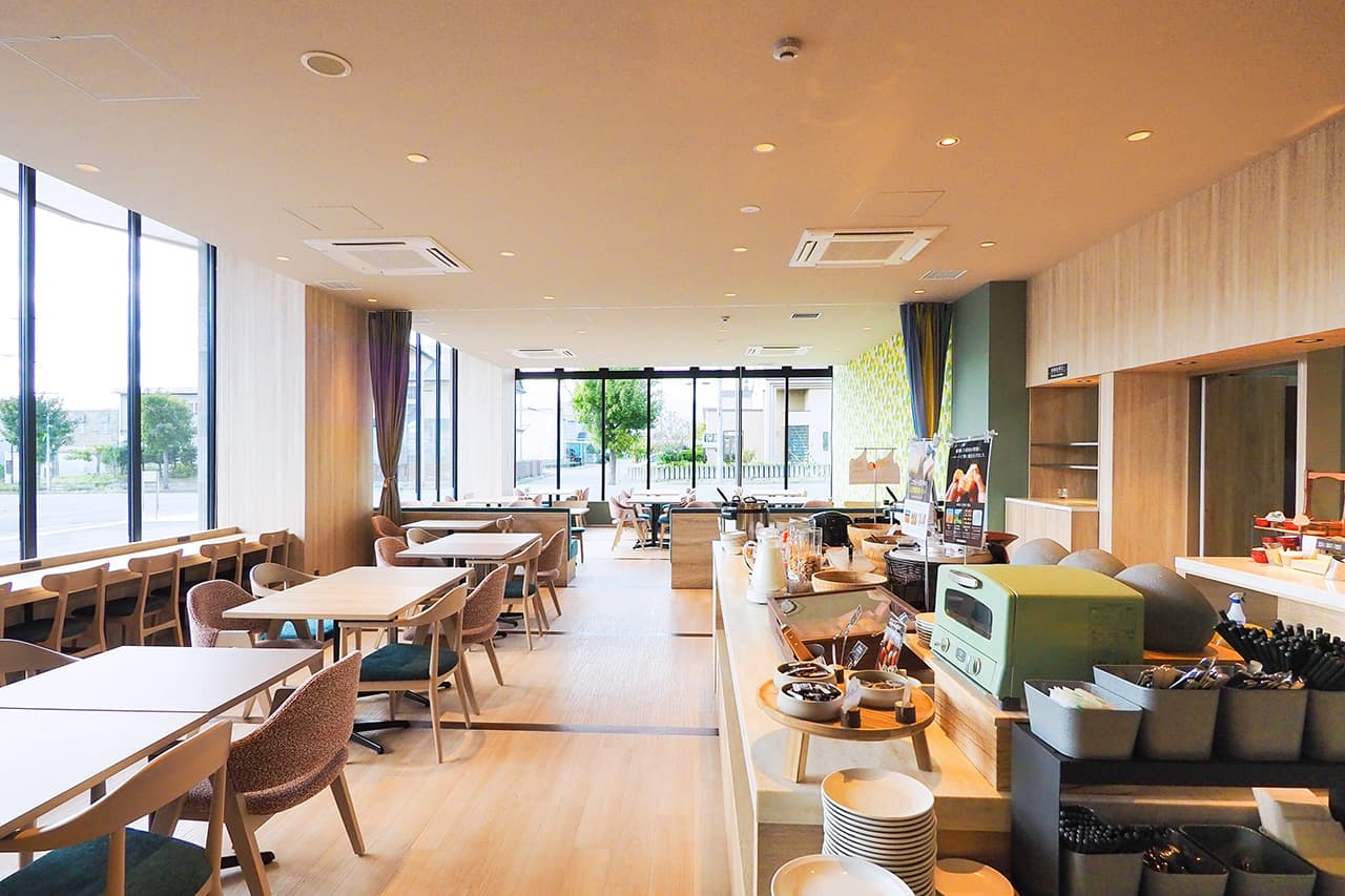 客室は愛らしさと親しみを感じる落ち着いたデザインで、慌ただしい日常から解放されるやすらぎの時間をご提供いたします。 大浴場は広々として開放感があり、移動やお仕事の疲れを癒し、ゆったりとくつろぐことができます。 朝食は体に優しい地元食材を使い、開放感あふれるレストランでご堪能ください。
