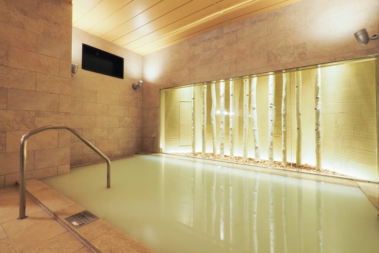 北海道らしさを感じさせる白樺を壁面にあしらった、落ち着いた雰囲気の大浴場です。